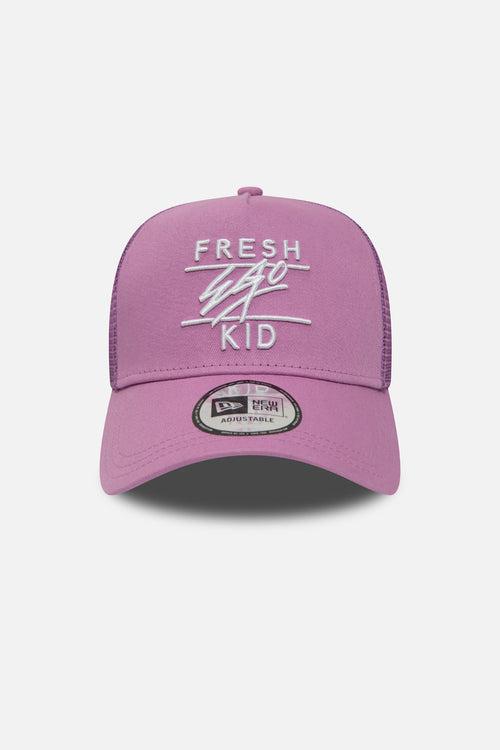Your summer essential: a classic New Era yellow A-frame trucker featuring the iconic Fresh Ego Kid heritage logo on the front, New Era Flag and FEK Heart to the side and rear.